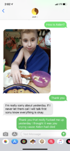My head is still racing from the phone call yesterday. The hardest part of being separated is when the boys are not here. I just need to know they are ok but I am so incredible terrified something will happen to Aiden and I will not be there. At 11 I text Josh “Is Aiden Ok?” I receive a photo of him sitting, eating bacon “thank you” I reply. My phone dings again “I’m really sorry about yesterday. If I ever let them call you I will talk first so you know everything is ok.” the night has cooled the space between us once more. I know we are both stressed out. We never really got along before Aiden got sick, so add one of the worst stresses anyone could ever have into into the mix and it is a recipe for disaster. We did not stand a chance.